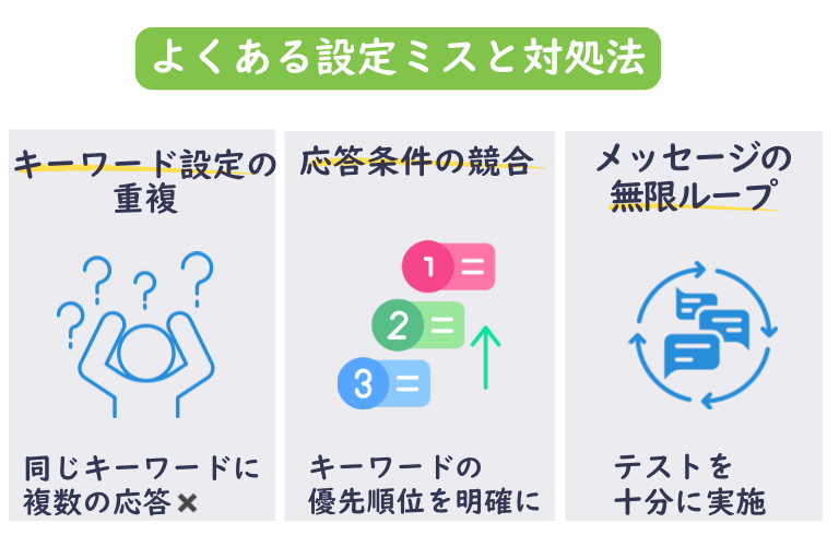 自動応答を効果的に運用するためには、設定時の注意点を理解し、よくあるトラブルを未然に防ぐことが重要です。多くの企業が陥りがちな失敗例を知ることで、スムーズな導入と運用が可能になります。