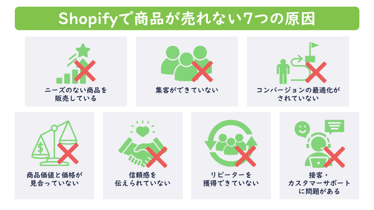Shopifyで商品が売れないときによく見られる7つの原因を紹介します。