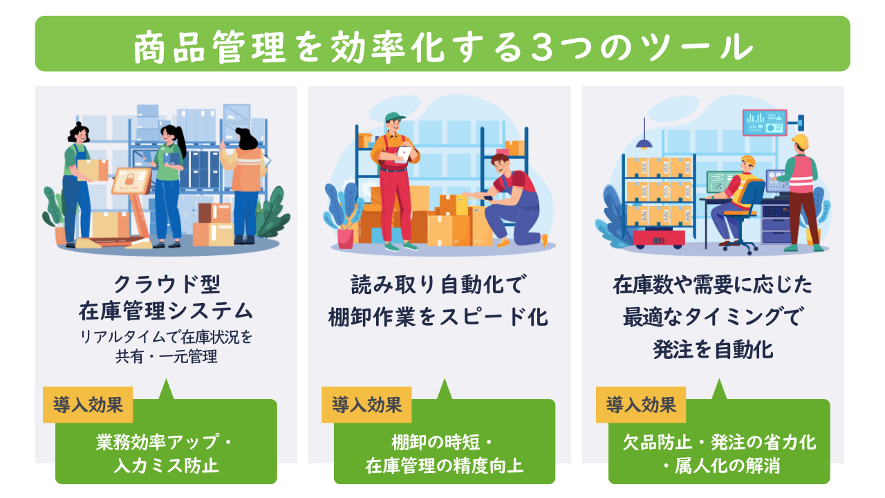 商品管理における現場の負担を軽減し、商品管理業務の効率化や正確性を向上させるために役立つ3つのツールを紹介します。