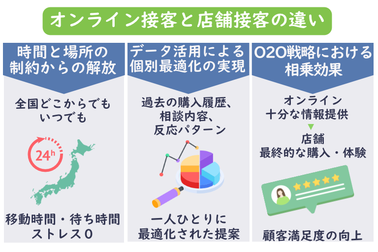 店舗接客では営業時間や立地による制約がありますが、オンライン接客では24時間365日の対応が理論上可能です。顧客も自分の都合の良いタイミングで相談でき、移動時間や待ち時間のストレスがありません。