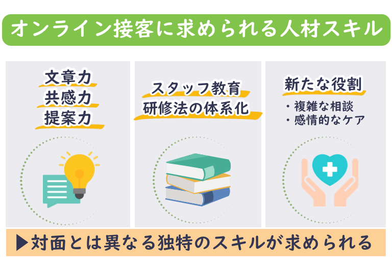 提案力については、限られた情報から顧客のニーズを把握し、最適な商品やサービスを推薦するスキルが重要でしょう。対面接客以上に論理的で説得力のある提案が求められます。