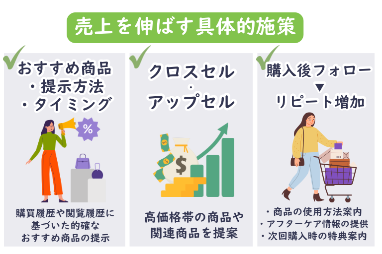 顧客の購買履歴や閲覧履歴に基づいた的確なおすすめ商品の提示により、客単価の向上が可能です。押し売りにならないよう、顧客の関心度合いを見極めながら、自然な流れで関連商品を紹介することが重要になります。