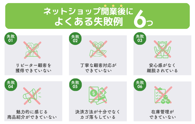 ここでは、ネットショップの開業後によくある6つの失敗例を紹介します。