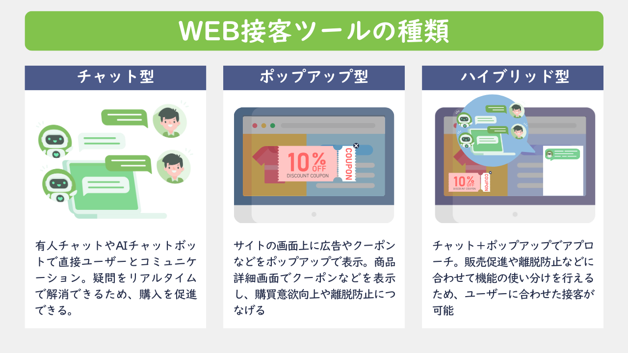 WEB接客ツールは主に3つの種類に分けられます。それぞれの特徴や違いを見て自社に適したものはどれかチェックしていきましょう。