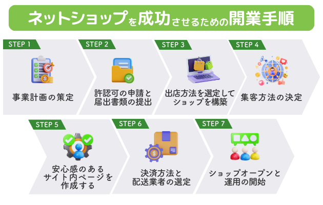 ネットショップの開業には多くの準備が必要です。ここでは、開業をスムーズに進める手順を7つのステップに分けて解説します。