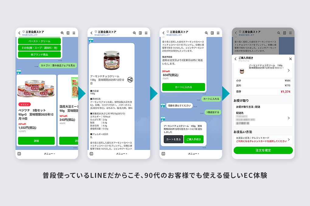 LINEのメッセージを見て「買おう」と思い立った瞬間に、数回のタップで購入まで完了できます。この購入までの動線の短さが、お客様の購買意欲を逃さず、大きな成果に繋がったのだと分析しています。